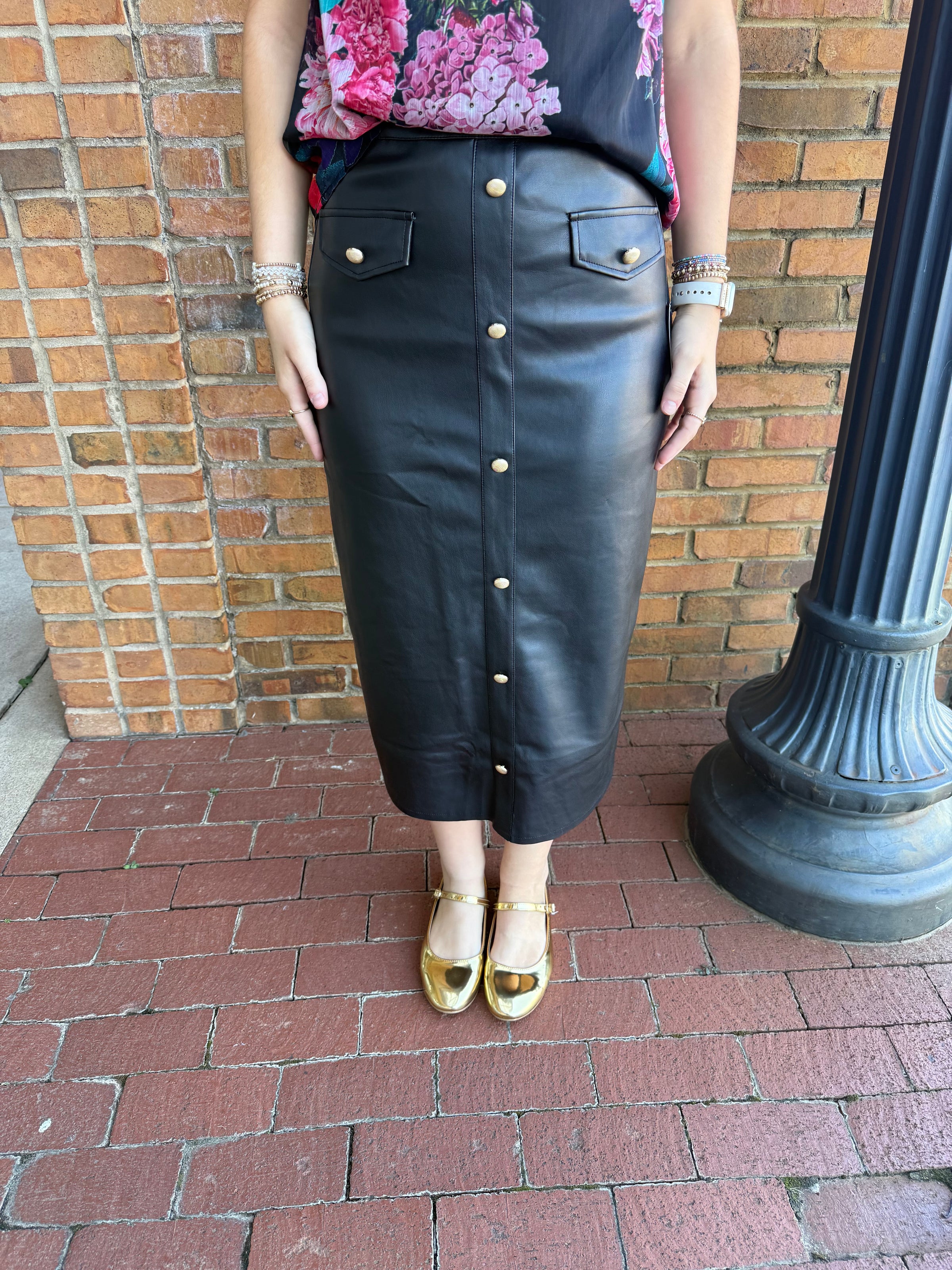 Elevate your style with our Black Faux Leather Skirt. Designed with a sophisticated gold button detail, this versatile piece is perfect for a girls night out. Its soft and faux leather material adds a touch of edge to your outfit, making it an essential addition to your wardrobe.