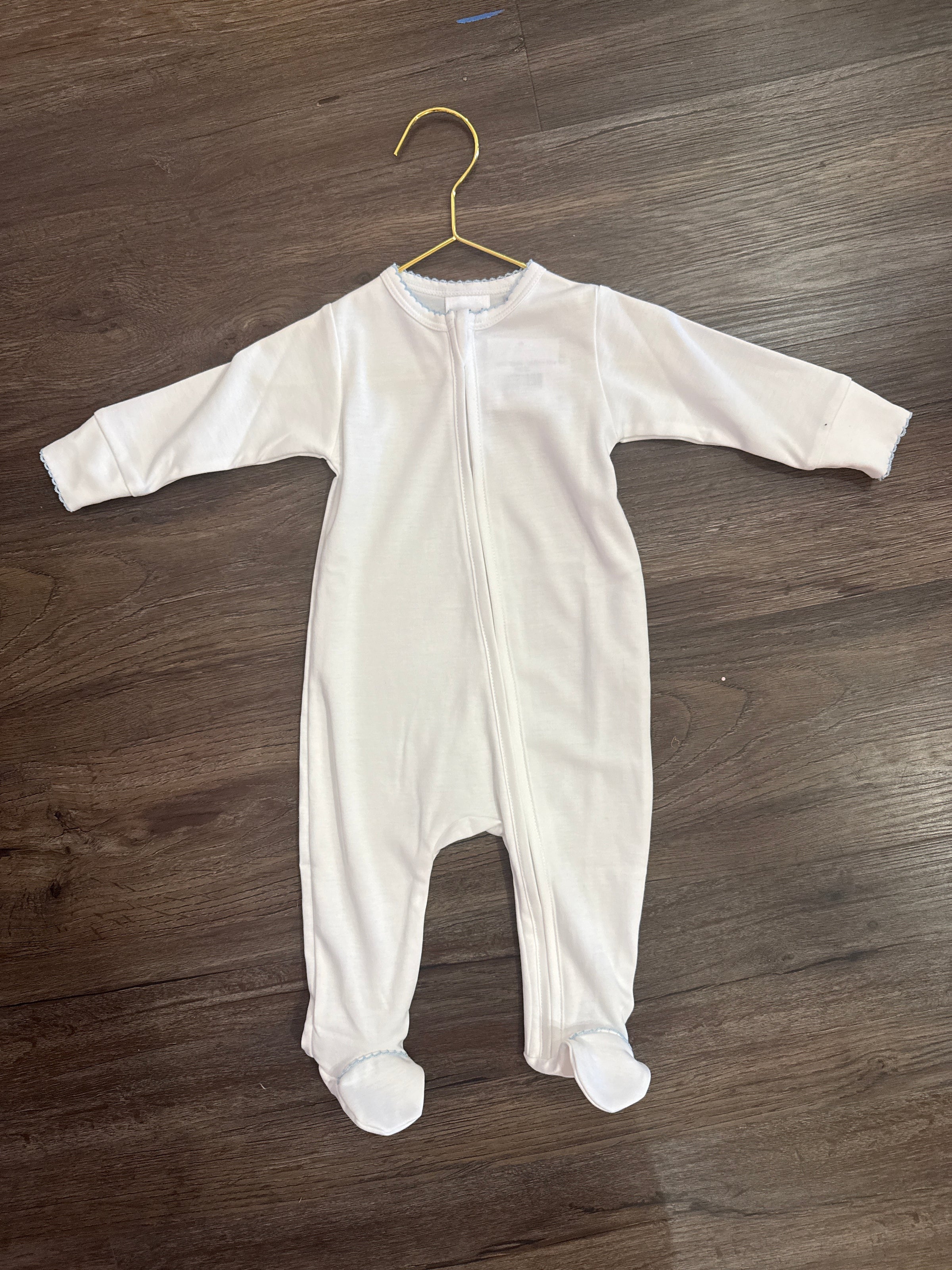 Cotton Zipper Footie - White w Blue Trim